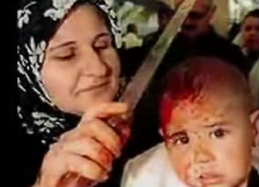In this image, a muslim shiite mother cutting the scalp of her child as a mourning for the death of their leader Al Hussein that was killed by the Sunni Muslims 14 centuries ago.