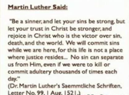 Martin Luther encourages you to sin strongly, there is not a place for justice in this life. No sin can separate you from Jesus even if we kill or commit adultery thousands of times each day, Martin Luther said.